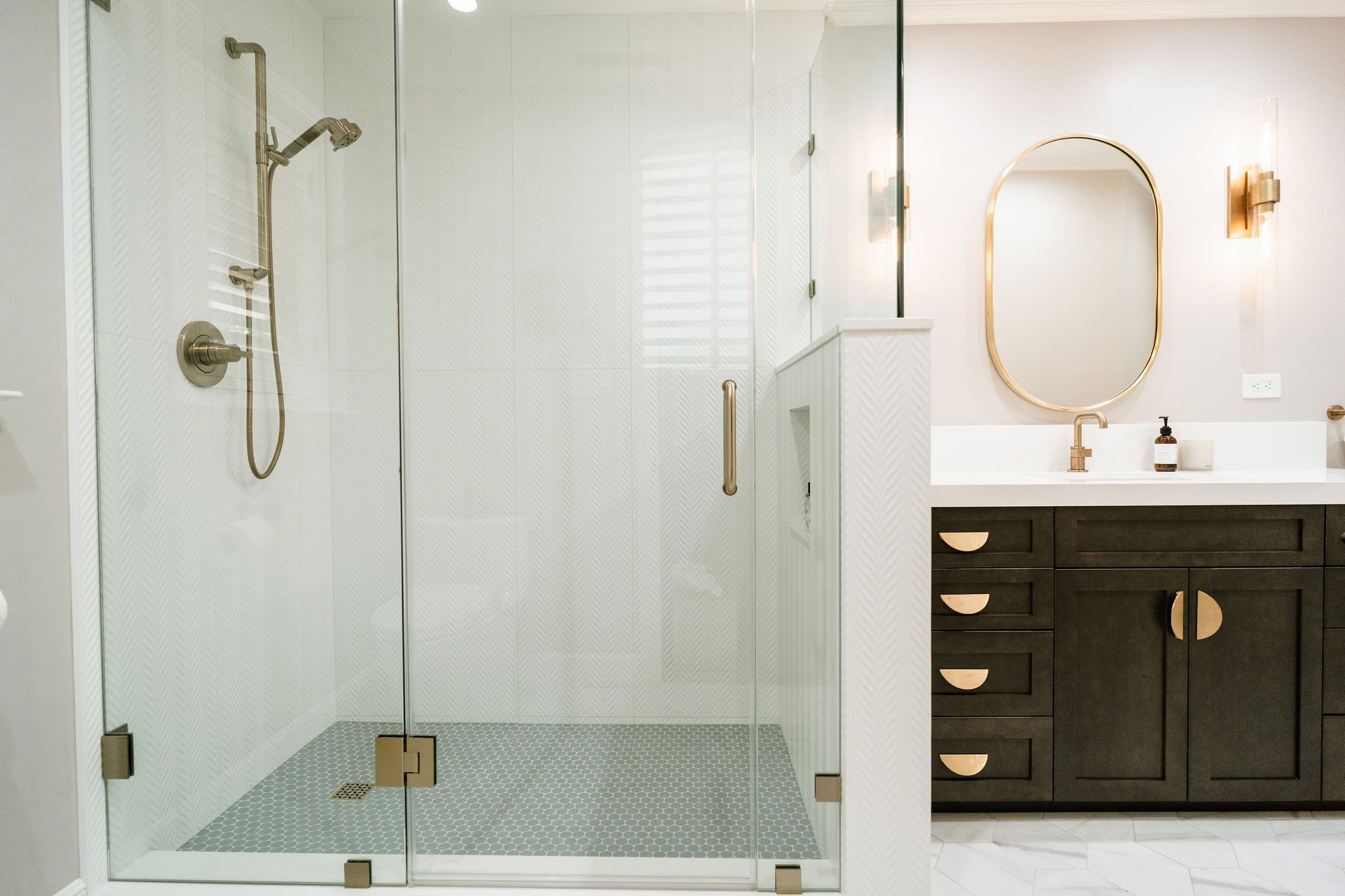 This remodeled bathroom transforms a playful kids' space into an elegant oasis, blending sophistication and functionality. Outdated fixtures and vibrant colors are replaced with sleek lines and soft grays and whites. A luxurious and a spacious walk-in shower with floor-to-ceiling tiles invite relaxation. Thoughtful storage solutions keep the environment clutter-free. Every detail is meticulously crafted for a stunning bathroom that offers a tranquil retreat, embodying custom craftsmanship and tailored design.