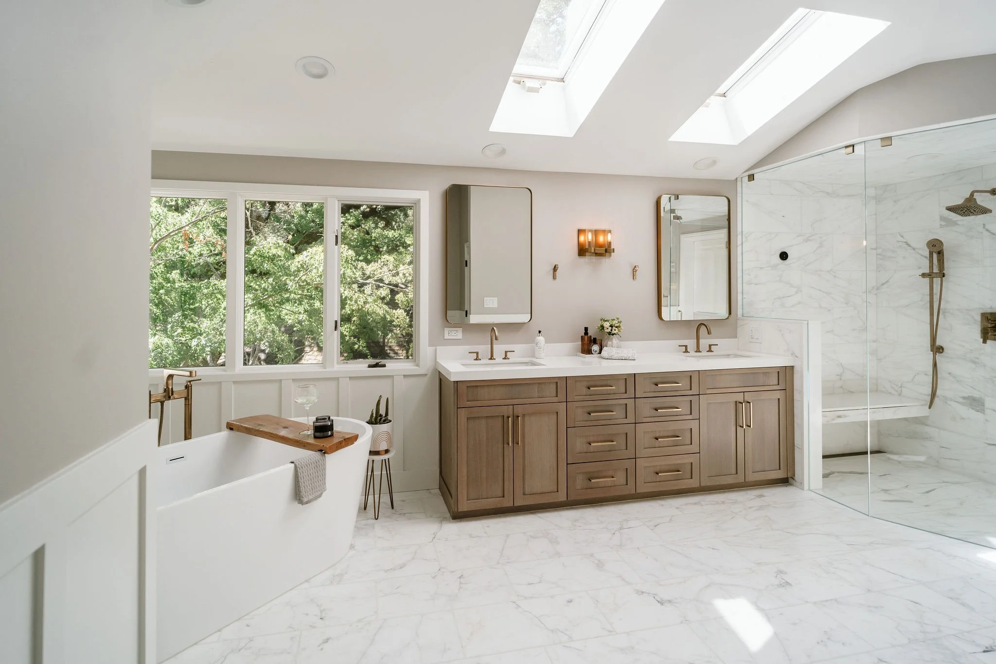 This stunning bathroom has been beautifully transformed into a serene modern spa retreat, skillfully blending elements of luxury and calmness. Soft, neutral colors artfully create an inviting and welcoming space that instantly soothes the senses. Notable highlights include a cutting-edge high-tech steam shower and a sumptuous soaking tub designed for pure relaxation after a long and tiring day. Every meticulous detail, from exquisitely chosen fixtures to finely crafted finishes, thoughtfully balances usability and elegance, making this a truly personal haven for relaxation and peaceful retreat from the chaos of everyday life.